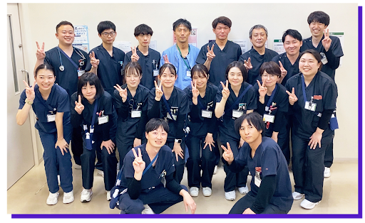 急性期の総合病院で幅広い業務内容があり、特に循環器でのカテーテル(虚血・不整脈)・デバイス対応、集中治療室での急性血液浄化は多くの症例に対応し、ロボット支援下手術、内視鏡スコープ操作、人工心肺、脳血管内治療などの最新のハイブリッドOPE室も含めた手術室業務も多岐に渡ります。